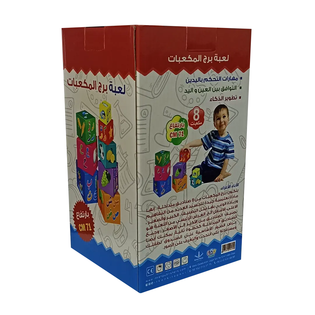 لعبة برج المكعبات لعبة تعليمية من ثماني مكعبات متداخلة، مفيدة وجيدة لتجسيد العديد من المفاهيم للطفل وزيادة الوعي بها، مثل التصنيف، الكبير والصغير، الأعلى والأسفل والأطول والأصغر ومفهوم الاحتواء ومفهوم التوازن والتأزر البصري الحركي ويمكن أيضاً عرض الصور الأساسية على الصندوق للطفل ومساعدته على التحدث والتعرف عليها حيث تحوي الصور على الحروف العربية وصور عن أمثلة مرتبطة بها وتفيد في تدريب الطفل على الربط و التسلسل وعلى الترتيب المنطقي وتعلم الطفل الألوان و المفاهيم